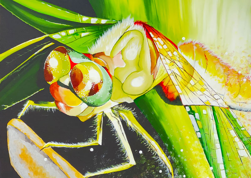 • A vivid close-up of a dragonfly resting quietly, full of colour, light, and detail